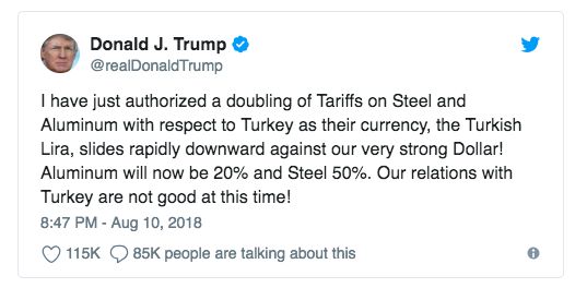 特朗普发推文(上图)表示,鉴于土耳其货币里拉对美元汇率快速走低,他已下令将土耳其钢铁和铝产品进口关税提高一倍,即分别征收50%和20%的关税