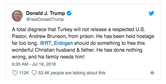 7月26日,美国副总统彭斯严厉地警告土耳其:"如果土耳其不立即采取行动释放布伦森牧师,将他送回美国,美国将对土耳其实施重大制裁,直到这个无辜的有信仰的人获得自由。"