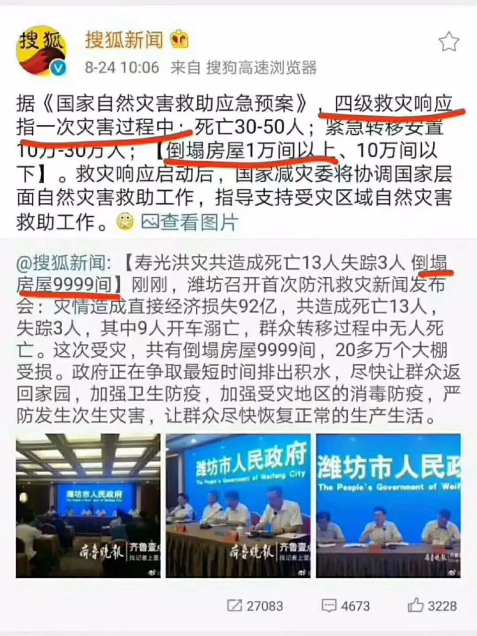 比故意制造灾难更可怕的是降级虚报。我们都知道一个基本的事实,就是每一次灾难来临的时候,官媒要么集体沉默,就像米脂案,上海外小杀人案,要么就是降级处理,报道的受灾人数和损失远远比实际少。就像搜狐新闻说的:“据《国家自然灾害救助应急预案》,四级静载想要指一次灾害过程中死亡30-50人;紧急转移安置10万-30万人;倒塌房屋10000间以上,100000间一下。就在相应启动后,国家减灾委将协调国家层面自然灾害救助工作,知道支援受灾区域自然灾害救助工作。”而潍坊防汛救灾新闻发布会公布说:灾情造成直接经济损失92亿,死亡13人,失踪3人,倒塌房屋9999间。一般灾难除了死亡和失踪的人数,其他都是约数,寿光却很牛逼,能够直接给出房屋倒塌的精确数字。更巧的是这个数字跟满足四级救灾响应条件中的房屋数只差了一间。国家应急预案规定,满足其中任何一条规定都可以适用。也就是说寿光房屋倒塌数量差1间就可以满足四级救灾响应的条件。