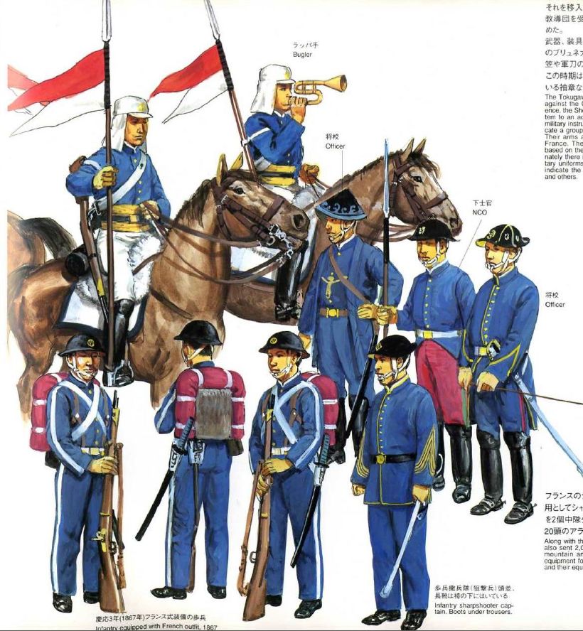 与淮军创立几乎同时的 1860 年代初,德川幕府为应对西南强藩的军事压力,挽救统治危局,模仿西方军事编制建立了第一支近代化部队,包含了步、骑、炮三军。1862 年,幕府出台系统了的军事改革方案,计划编练新式陆军 12000 多人,需军官 1400 余名,其中的炮兵、轻步兵士官原则上要求由掌握西方战术知识的武士充任。