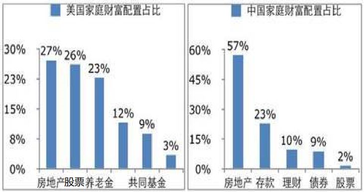 对比中美两国家庭财富的构成,就可以大体看出股票市场在中国和美国扮演的不同角色。美林银行研究部的数据显示,2015年中国家庭财富接近六成配置于房地产,其次是银行存款,占比23%。股票与不动产之比为约为1:28;而美国的家庭财富中房地产、股票及养老金中,分别占比27%、26%、23%,存款占比仅12%,股票与不动产之比接近1:1。