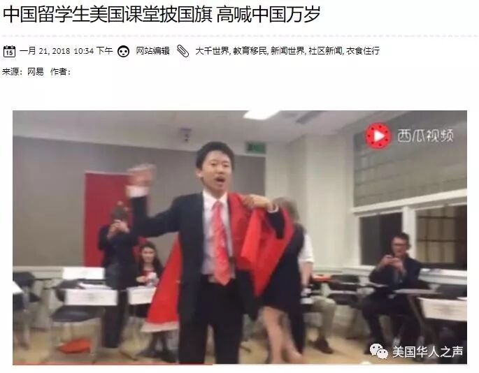下面这张照片是一个留学生在美国课堂披国旗 高喊中国万岁(今年发生的事情):