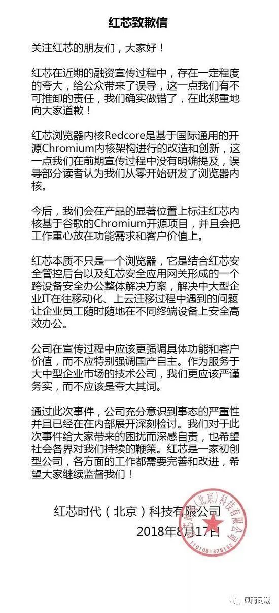 有趣的是,刚完成2.5亿元C轮融资大涨国人士气的红芯浏览器近日也露馅了,有好事网民对红芯浏览器安装包解压后发现,这款宣称拥有完全自主核心知识产权的国产浏览器“只是谷歌浏览器换了层皮”。这帮科技骗子一开始回应称是“站在巨人的肩膀上”,可是巨人并没有同意侵权抄袭啊!于是很快又发出了《红芯致歉信》,表示夸大宣传,不应强调是自主国产。