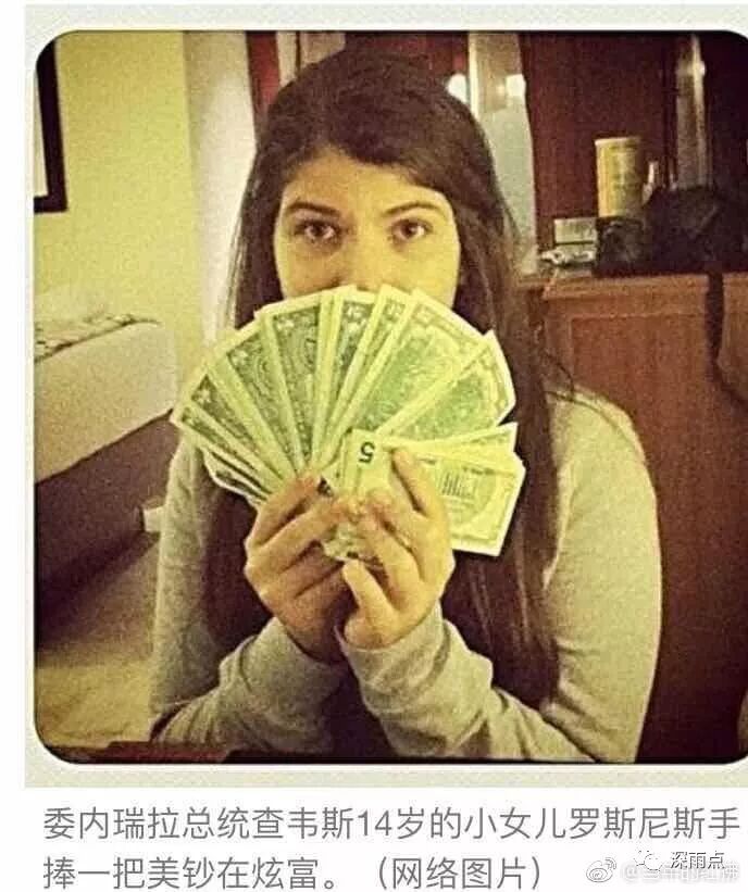 然鹅,这位视美帝如魔鬼的反米逗士,却有一名爱晒美钞的女儿。在小姑娘把照片po上网之后,地球人都震惊了,最震惊的是部分“没见过世面”的委國人,他们纷纷表示:“我身边无论如何找不到一张美钞,除非我上黑市去买。”“在委内瑞拉,食用油、咖啡、白糖和美元一样稀缺。”