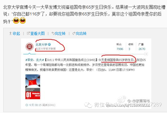 一大早,北京大学官方账号发微博祝“祖国母亲”生日快乐。唉!这智商,自己116岁了,要祝一个65岁的“母亲”生日快乐,有校友看不下去。严肃认真地批评了一下,它果然删贴了。