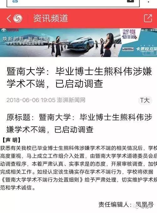 2018年7月1日,暨南大学博士熊科伟公开发表论文抄袭事件处理结果:熊科伟在读期间公开发表的论文不符合学术规范,存在严重抄袭、剽窃现象,情节恶劣。