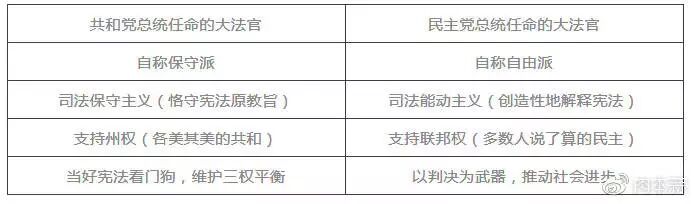 那么这个问题怎么解决呢?很遗憾,没有办法解决。只能靠大法官自律。美国最高法院九个人,由在任美国总统任命。一旦任命并通过国会批准,就是终身制。除非自愿退休,没人能开除他们。这九个人,虽然设一名首席大法官,但投票时还是一人一票。因为是总统任命,所以大法官也表现出明显的政治倾向。其区别如表:
