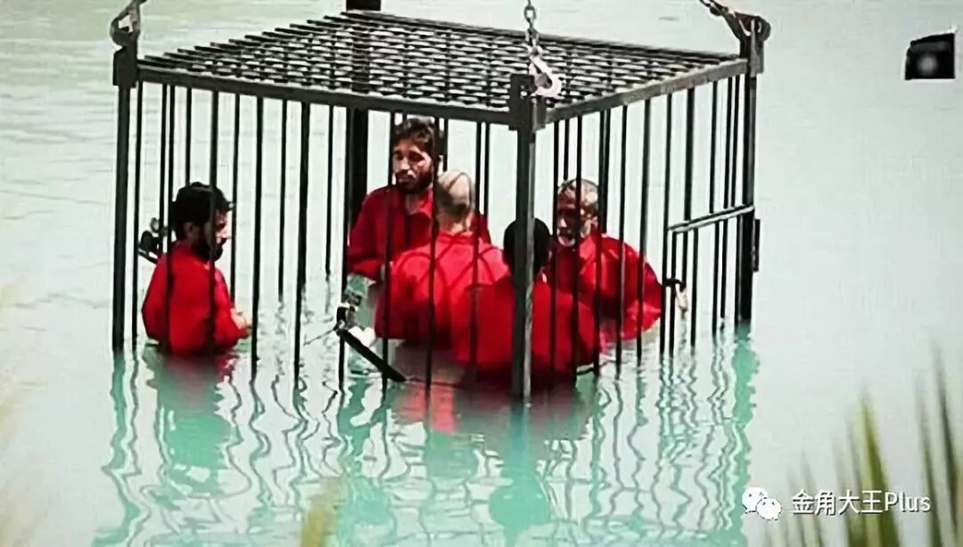 接着,五名同样穿着红色衣服的男子,被置身在一个铁笼中,慢慢地沉入水中。水慢慢没过他们鼻孔时,他们不断跳跃,尝试让自己能够呼吸,以多活几秒钟。但这些都是徒劳,由于他们脖子被锁定在笼子的铁条上,他们头顶没入水中,一连串水泡涌向水面后,彻底没了气息。