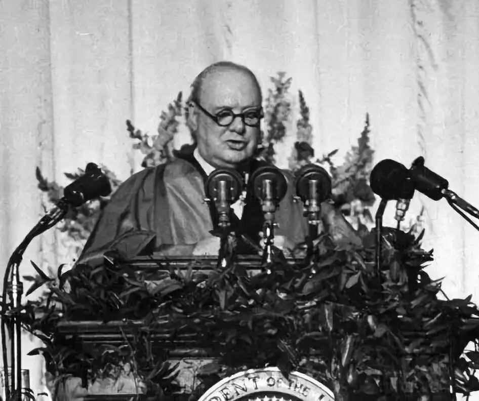 | 1946年1月,英国首相丘吉尔应邀访美。3月5日,他在美国总统杜鲁门陪同下抵达密苏里州富尔顿,在杜鲁门的母校威斯敏斯特学院发表了题为“和平砥柱”的演说。演讲中,他说:“从波罗的海海边的什切青到亚得里亚海边的里雅斯特,已经拉下了横贯欧洲大陆的铁幕。这张铁幕后面坐落着所有中欧、东欧古老国家的首都——华沙、柏林、布拉格、维也纳、布达佩斯、贝尔格莱德、布加勒斯特和索菲亚。这些著名的都市和周围的人口全都位于苏联势力范围之内,全都以这种或那种方式,不仅落入苏联影响之下,而且越来越强烈地为莫斯科所控制。”“几乎在每一处都是警察政府占了上风……根本没有真正的民主。”丘吉尔还指出,在“铁幕”外面,共产党的“第五纵队”遍布各国,“到处构成对基督教文明的日益严重的挑衅和危险”。丘吉尔呼吁英美联合起来,建立“特殊关系”,推动西方民主国家“团结一致”。 |