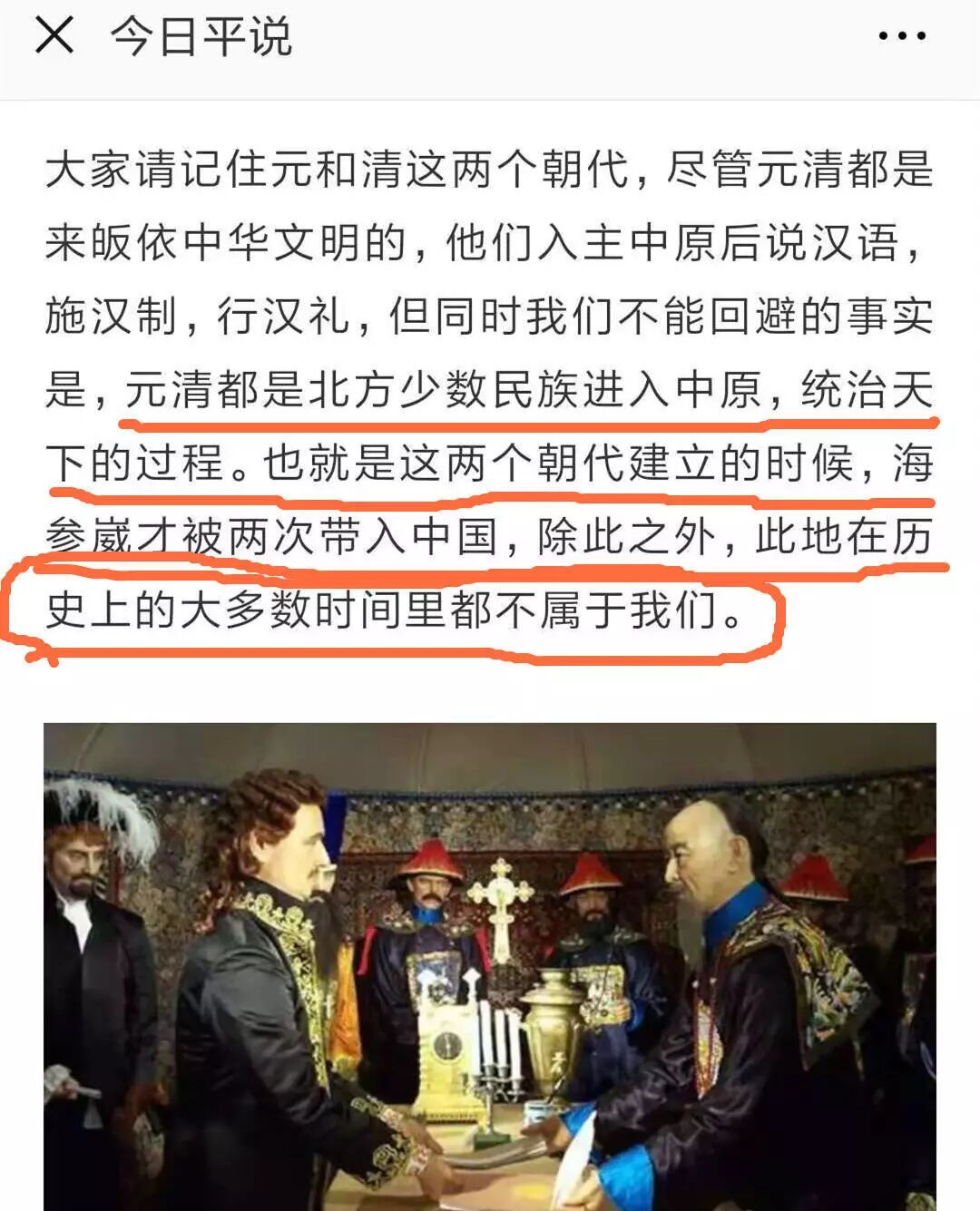这段话的意思很明确,就是认为元朝和清朝是"北方少数民族进入中原",海参崴只是他们的东西,就像冲进你家的强盗口袋里的手机一样,虽然随强盗带进了你家,但那也不是你的,强盗一撤手机也就同时走了。