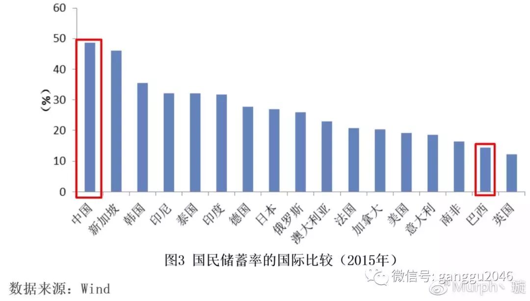如上图,由于福利水平较低,所以我国的居民储蓄与政府储蓄均远远高于美国。说到福利,看到第一张图的朋友们不知道会不会想到巴西这个国家呢?