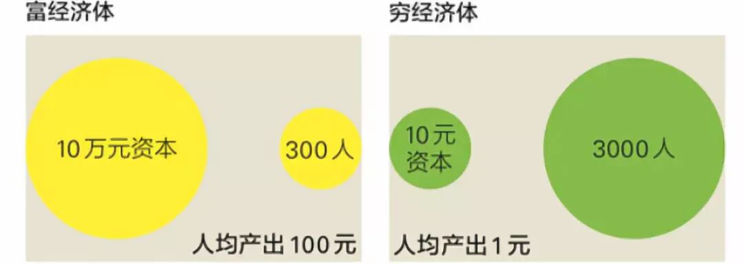上面说的是国内,再看看全球。由于打通了两个"海平面",全球经济结构也发生了巨大变化。原来就是富经济与穷经济,一个高海平面,一个低海平面。如果中间有壁垒,不开放,那就各过各的日子。发达国家资本多,生产力高,收入高,就是蓝领工人也可以过得好。穷国因为资本很少,生产力很低,收入很低,积累很少。