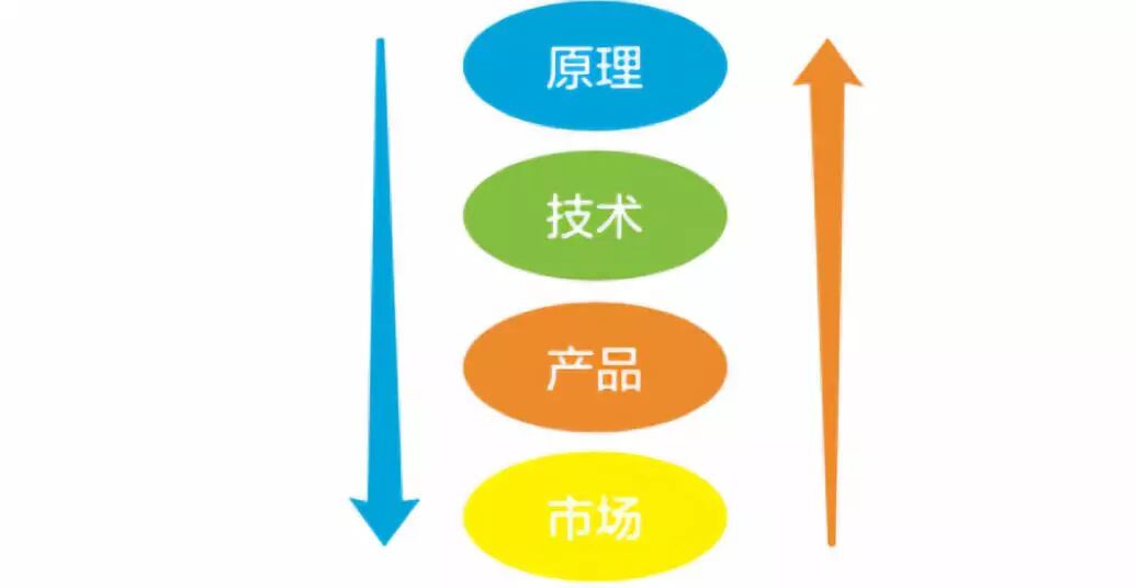 这是我2016年来腾讯交流的时候就讲过的一张图。创新要有原理,原理要有应用技术、关键技术、辅助技术,再生成产品,这个产品打出一片市场来,这都叫创新。创新有两种路径,一种是上行的创新路线,从市场出发,看到有消费者潜在要的东西,就去开发产品,产品开发不出来找技术,技术攻不下来最后找科学院,找院士,看通过什么原理解决它,这是一条路径,也是我们到目前为止主打的路线。第二条路线,我认为对未来的创新更重要,是从原理出发,从摸索自然规律出发,看看这个原理有没有新的技术支撑,技术能不能整合成产品,产品能不能跟消费者的需求结合。