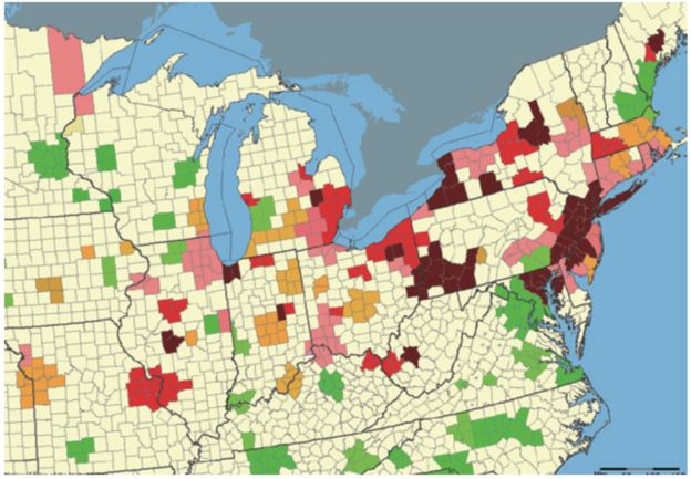 在这张图里,颜色越深就锈得越厉害,全是美国早期工业化的地带,东北部,加到一起就是政治。美国是选票政治,这个地带有人的,活生生的人。我们埋头干活,出口一船又一船,你不知道对那头发生的影响。