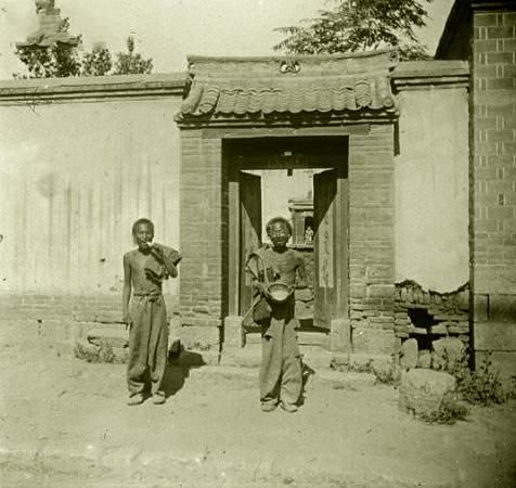 图为两个瘦骨嶙峋的乞丐,一个在吃东西,另一个在展示他的空碗!