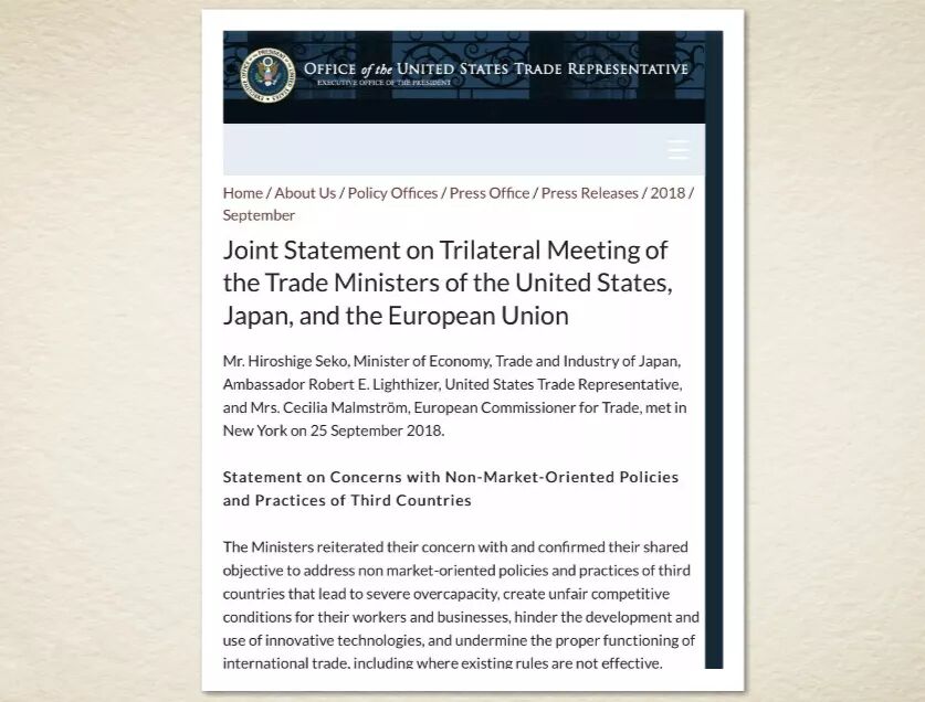 9月25日,美国、欧盟和日本三方签署了贸易相关的三方联合声明"美日欧联合声明"