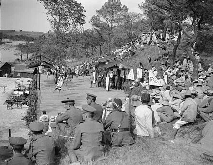 △几名劳工表演传统戏曲娱乐其他劳工和部分英军士兵,可以看到英国与中国观众被一道铁丝网分开。照片摄于埃塔普勒,1918年6月。