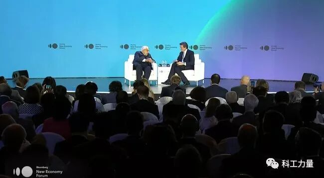 彭博新闻社总编辑米思伟在与美国前国务卿、前国家安全事务助理、彭博创新经济论坛名誉主席亨利·基辛格进行对话