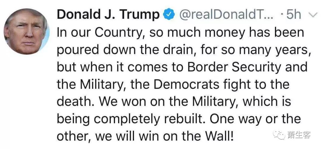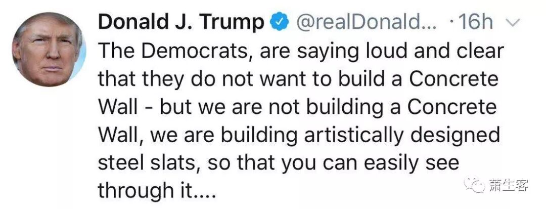 政府花了很多精力金钱派了十万军队与警力,许多民兵也自动加入,去严守边境,但危机仍然日益加重。你不妨随手网路搜索,便了解到大篷车的边境危机故事。在无边墙的地段,天天上演肉搏,用孩子妇女当挡箭牌,強闯入境的真实电影片段,无奈警力有限,政府军队老百姓盼修墙望眼欲穿,近两个月的时间过去了,快值圣诞节日了,国会通过修墙的50亿预算也快成泡沫了,看看今天川普总统(12月19日)发的推特吧。为了安抚民主党不想建混凝土墙压抑的小心脏,推出具有艺术设计美感可以透视看穿的钢板条墙,但仍然显出无奈,也没有什么办法可以拿到修墙的钱。