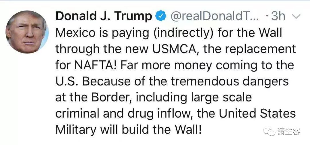 墨西哥通过替代北美自由贸易协定的新的美加墨贸易协定(间接)支付边境墙的费用。更多的资金正在流入美国。由于边境的巨大危险,包括大规模的犯罪和毒品流入,美国军方将会建造边境墙l!