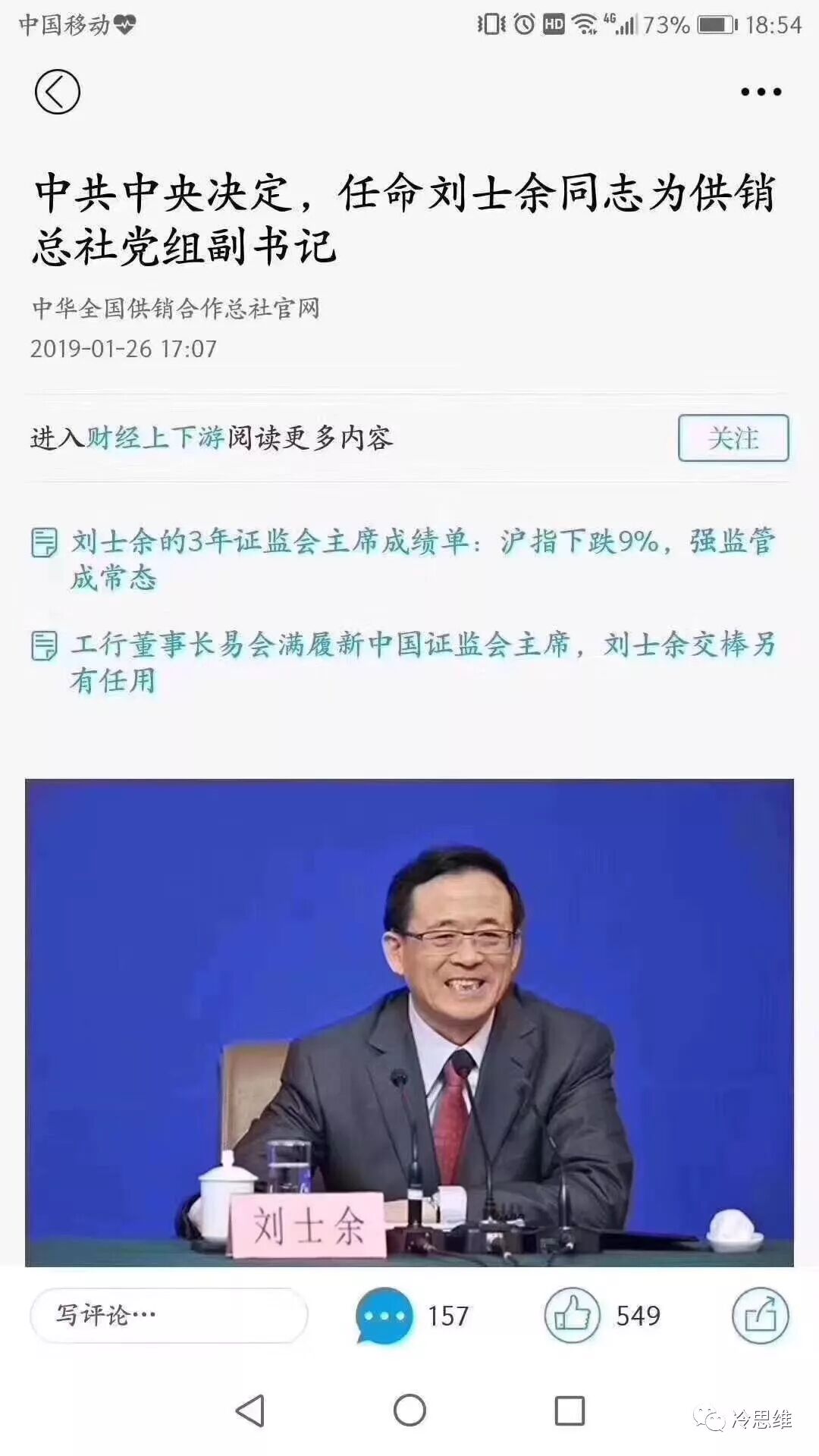 昨天,将我们的大A股做到了铁底的刘主席光荣调岗了,所有的上市公司,基本大股东无不股抵押,董事长跑路蔚然成风,所以现在到底是铁底还是铁顶,估计只有冷眼旁观的人最清楚。但是不管怎么样,刘主席还是让上市公司哀鸿遍野,光荣上任到新的部门,大家猜猜是哪里?今天任命刚出来,供销社党组副书记。