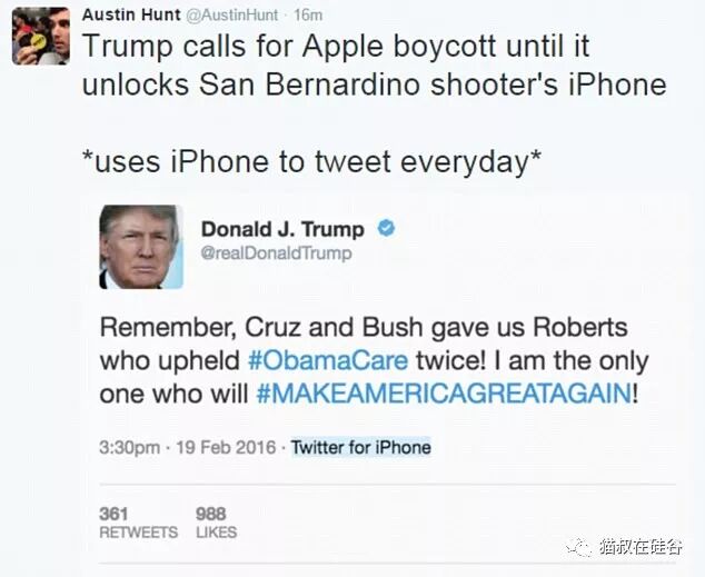 周日的早上,和往常一样,特朗普早上起来就开始抱着iPhone刷推特,尽管他曾在2016年公开呼吁抵制苹果。当时苹果拒绝配合美国联邦调查局(FBI)的要求,解锁南加州恐怖袭击嫌犯的iPhone手机。特朗普当时表示,苹果不配合解锁,自己就只用三星手机。虽然苹果始终坚持不配合解锁,FBI找了外部安全公司帮忙,但也许特朗普忘了这事,也可能宽容地原谅了苹果。总之,他还是继续用着iPhone。