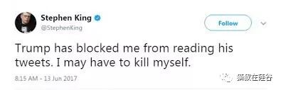 得知这一判决之后,美国最伟大的小说家史蒂芬·金(Stephen King)一定感慨万千。2017年6月,史蒂芬·金在推特上接连讽刺特朗普之后,发现自己居然被美国总统拉黑了!此生受尽景仰、处处鲜花掌声的大师史蒂芬·金哪里受过这样的气,比特朗普小一岁的七旬老汉气愤地连发三条推特抱怨自己被拉黑,甚至嚷嚷着要自杀。