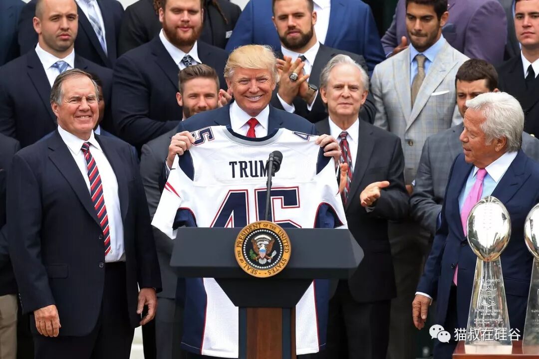 晚点10点43分,在结束这推特一天的最后几发,特朗普甚至还涉及了体育话题,涉及到了美式足球和棒球这两个美国民众最热爱的运动。他恭喜了美式足球大联盟(NFL)的新英格兰爱国者队再次闯入超级碗总决赛,恭喜了爱国者队老板卡夫特(Bob Kraft),恭喜了爱国者队的教练比利奇克(Bill Belichick)和该队不老四分卫传奇汤姆·布雷迪(Tom Brady)。他们曾经是特朗普的好友,卡夫特在特朗普竞选总统时曾经慷慨解囊资助。