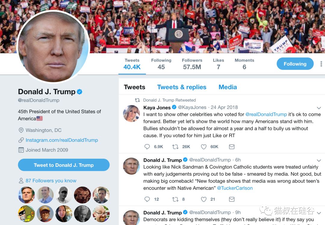 昨天是美国联邦政府关门的整整第三十天,美国总统特朗普一天发了42条推特。从早上7点多直到晚上11点多,大统领一直在孜孜不倦地抱着手机刷推特。看得出来,这位72岁的老汉是一名不折不扣的社交媒体重度用户。拥有5750多万粉丝的他绝对是美国最懂社交媒体的政治人物,没有之一。