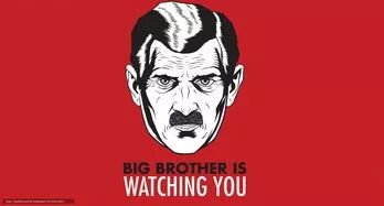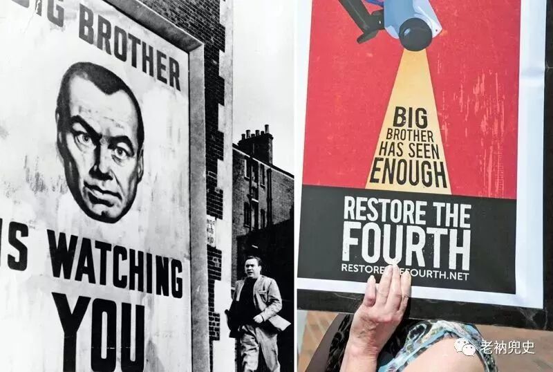 左图/由奥威尔的小说改编的电影《1984》剧照。右图/7月4日,美国波特兰市,反对者举着"老大哥已经知道得够多了"的标语抗议政府的监控计划。美国"复兴第四修正案"团体选择在独立日这天发起全美示威活动,抗议国安局(NSA)藐视宪法搜集情资。美国法律第四修正案规定,民众及其财产享有免受"不合理搜查的权利"