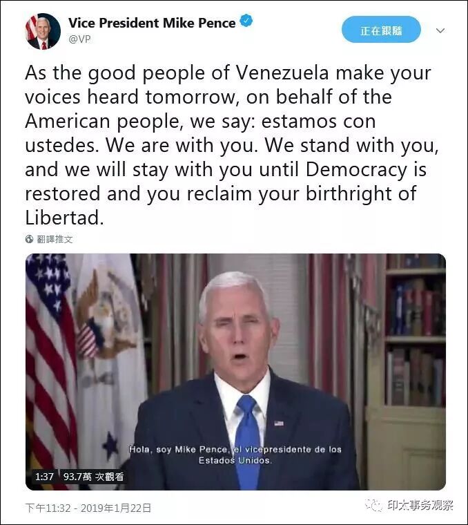 地区重要国家——比如美国,公开声明将向临时政府提供帮助,并将一切选项摆到桌面上,这就意味着,如果有必要,美国可能对委进行军事干预。受临时政府请求,一笔对委2000万美元的人道主义援助,则已由美国国务卿蓬佩奥签发。