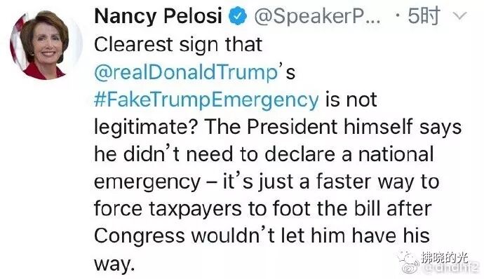 于是师太佩罗西又得意洋洋发推曰:"金毛狮王,你自己都亲口承认你不需要宣布國急状态-这只不过是在國会不让你得逞之后,你使出的一个走捷径的小花招,好让納稅人掏腰包。"