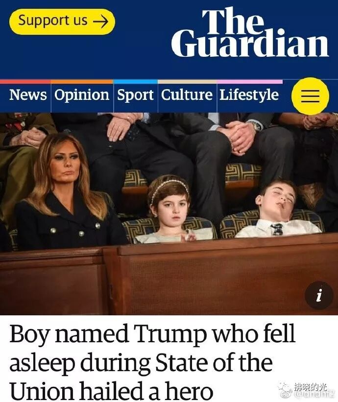 最后,本度咨文发表会还有一个小小的花絮,一个应邀参加旁听的小家伙听着听着就睡着了,而这个叫约书亚·川普的小家伙是第一夫人邀请来的嘉宾之一,且就坐在梅拉妮亚的左手第二位。