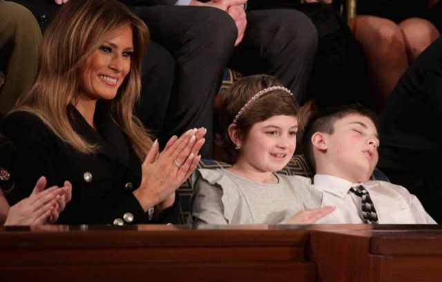 最后要提的是个有意思的客人,这是跟着总统"倒霉"的小家伙约书亚·川普。他11岁,来自特拉华州。虽然与总统同姓,但他与总统绝不沾亲带故。也许因为川普总统备受争议,约书亚因为姓"川普",跟着"吃瓜落儿"。淘气的孩子们因为他姓"川普",时不时欺负他(学校很快做了处理并采取了适当措施)。总统以特殊的方式给他找回了面子:约书亚小朋友作为第一夫人的客人,坐在了国会大厅的的贵宾席上。不过,这小家伙没给总统多大面子,人们给总统鼓掌的时候,他却呼呼大睡。