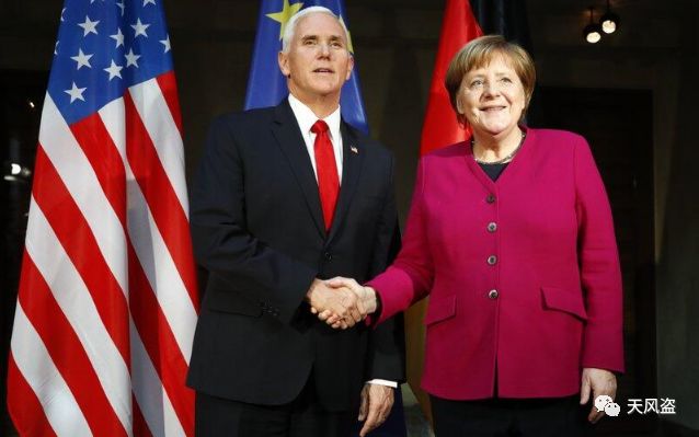 (2019年2月16日,慕尼黑安全会议,彭斯与默克尔。彭斯在发言中,明确发出要求欧盟各国在波斯及瓜伊多等事件上的站队信号。法德当前所表现出来的强硬,性质上只是一种挣扎的方式。)