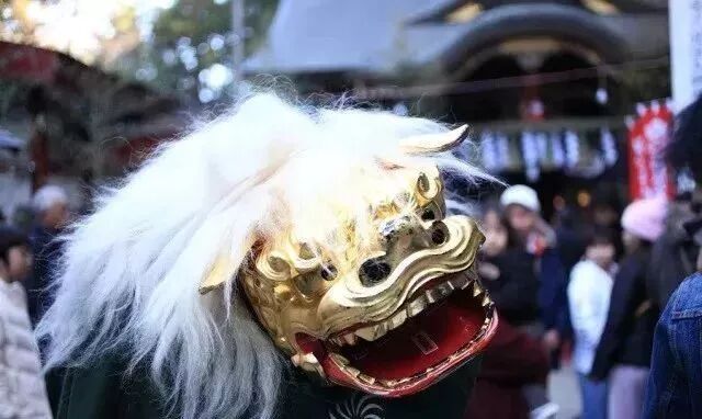 在新年的庆祝活动场地和神社都会配上节庆音乐表演舞狮