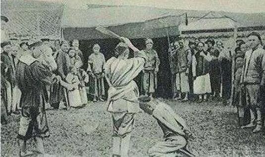 现场的刽子手一共有两个,罪犯排好位置后,一个刽子手负责选一把好刀,另一个刽子手负责把罪犯头上的竹片拿下来。一切就绪后,准备行刑了。对于砍头的过程,作者是这么记录的: