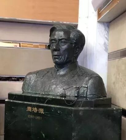 演讲现场的前北京大学校长、物理学家周培源雕塑像。