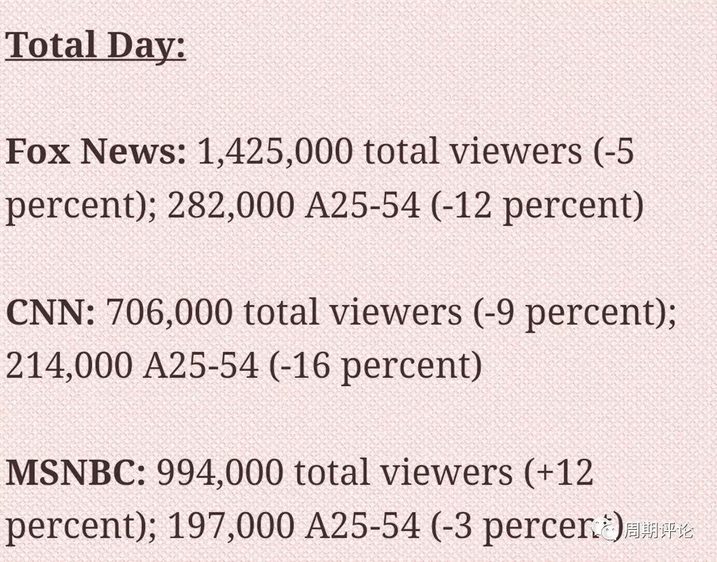 2016总统大选时,主流媒体就黑川普,而且一致预测希拉里将胜出,结果被选票狠狠地打了脸。执政后,主流媒体的【黑川】大业一天也没停,结果是川普没受太大影响,反而是他们自己在一定程度上被人民看穿了,收视率低迷,FOX意外的成了最大赢家!