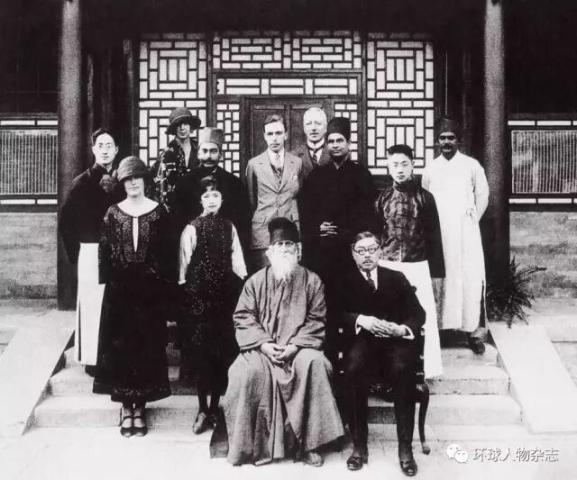 1924年,泰戈尔与徐志摩(三排左一)、颜惠庆、林徽因(二排左二)、恩厚之等人在景山庄士敦家门口。