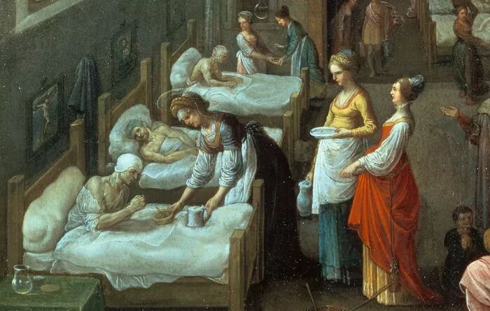 历史上第一所医院由巴西尔主教在卡帕多西亚于公元369年建立,收住并护理病人。后来,北非主教奥古斯丁在西方建了不少医院。到了6世纪,医院成了修道院的一个常规部分,这些基督教医院都是世界最早的、志愿性质的慈善机构,当时的医院常称作"救济院",直到12世纪以后,"医院"一词才普遍使用。时至13世纪,欧洲绝大多数医院都是由基督教会监督管理,到14世纪,欧洲医院已经星罗棋布,英国人常把医院说成"上帝之家"。德国一种遍布乡镇的小医院则称为"圣灵之家"。