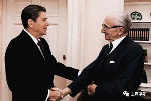 1981年,里根总统在白宫会见哈耶克。