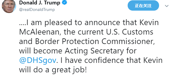 (续上)我很高兴地宣布,现任美国海关和边境保护局局长Kevin McAleenan将成为国土安全部的代理部长,我相信凯文会做得很好!