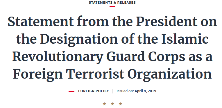 总统关于指定伊斯兰革命卫队为外国恐怖组织的声明