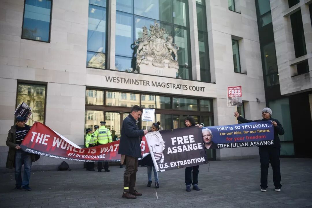 支持阿桑奇的人,拉起了"Free Assange"的横幅,认为对阿桑奇的迫害是"1984"的现实重现。