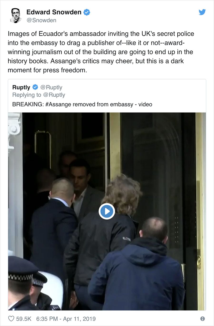 美国的另一个国家公敌、现在被俄罗斯收留的斯诺登也在推特上说,这是"新闻自由的至暗时刻"。