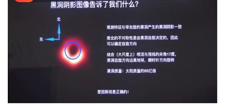该图像的许多特征与爱因斯坦广义相对论的预言完全相一致,在强引力极端环境下进一步验证了广义相对论。中国科学院上海天文台研究员袁峰在现场表示,现在看到的照片大体来说有两个部分,一部分是中心区域不太发光的阴影,另一部分是围绕这个阴影的发亮的圆环。圆环发的光就是从吸积盘上发出的,而黑色的阴影要比黑洞本身要大几倍,这证实了爱因斯坦广义相对论的预言。