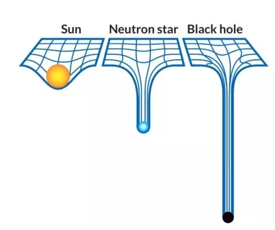 图丨根据广义相对论,太阳会弯曲时空使行星绕着它运行,中子星会使时空弯曲更厉害,而一个黑洞则会在时空中制造一个深坑,即使是光都无法逃脱(来源:JAMES PROVOST)