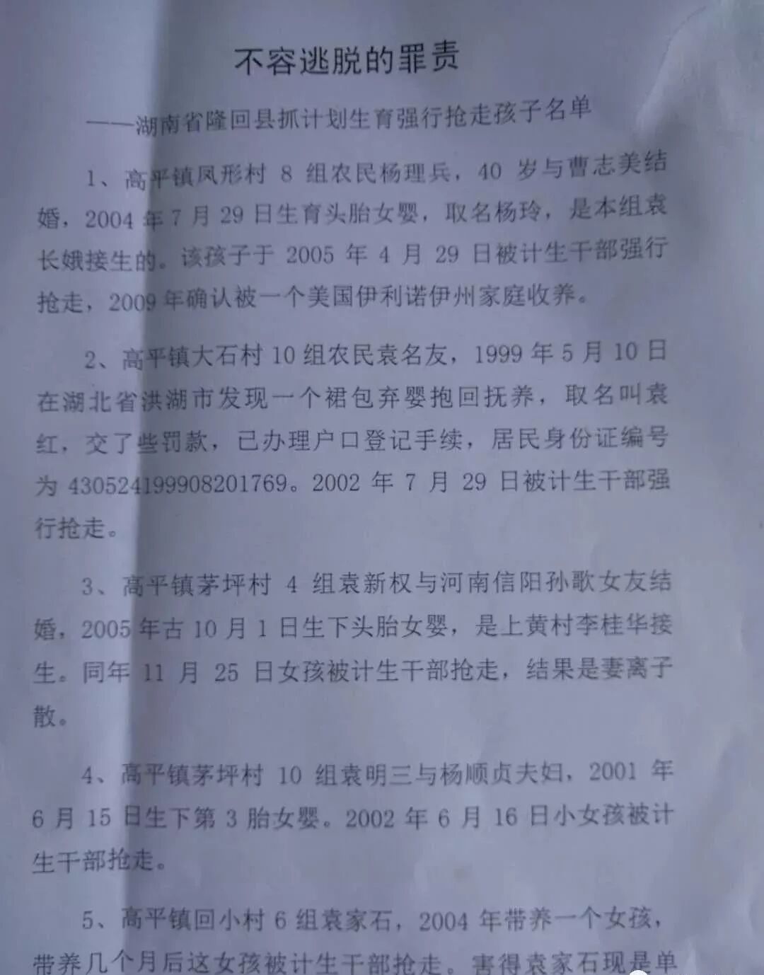 3、2002年6月16日,茅坪村袁明三第三胎女婴被抱走。
