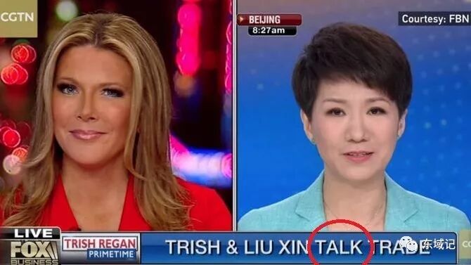 这是美国FOX电视台的直播画面,标题是:TRISH和刘欣TALK贸易问题。